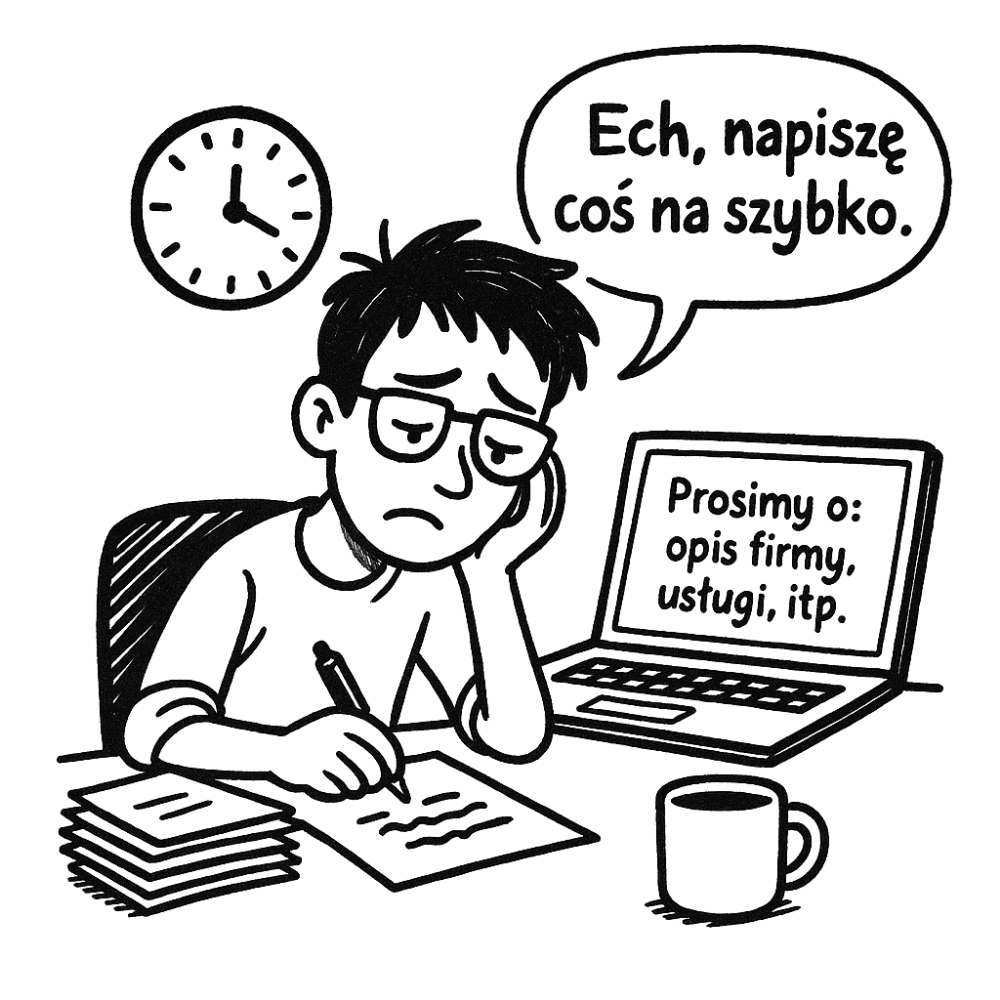 Agencja mówi, że pan Karol może dosłać teksty, ale jeśli ich nie ma, to mogą przygotować sami (spoiler: wygenerować w jakimś AI lub zlecić pierwszemu lepszemu copywriterowi za 30 zł).